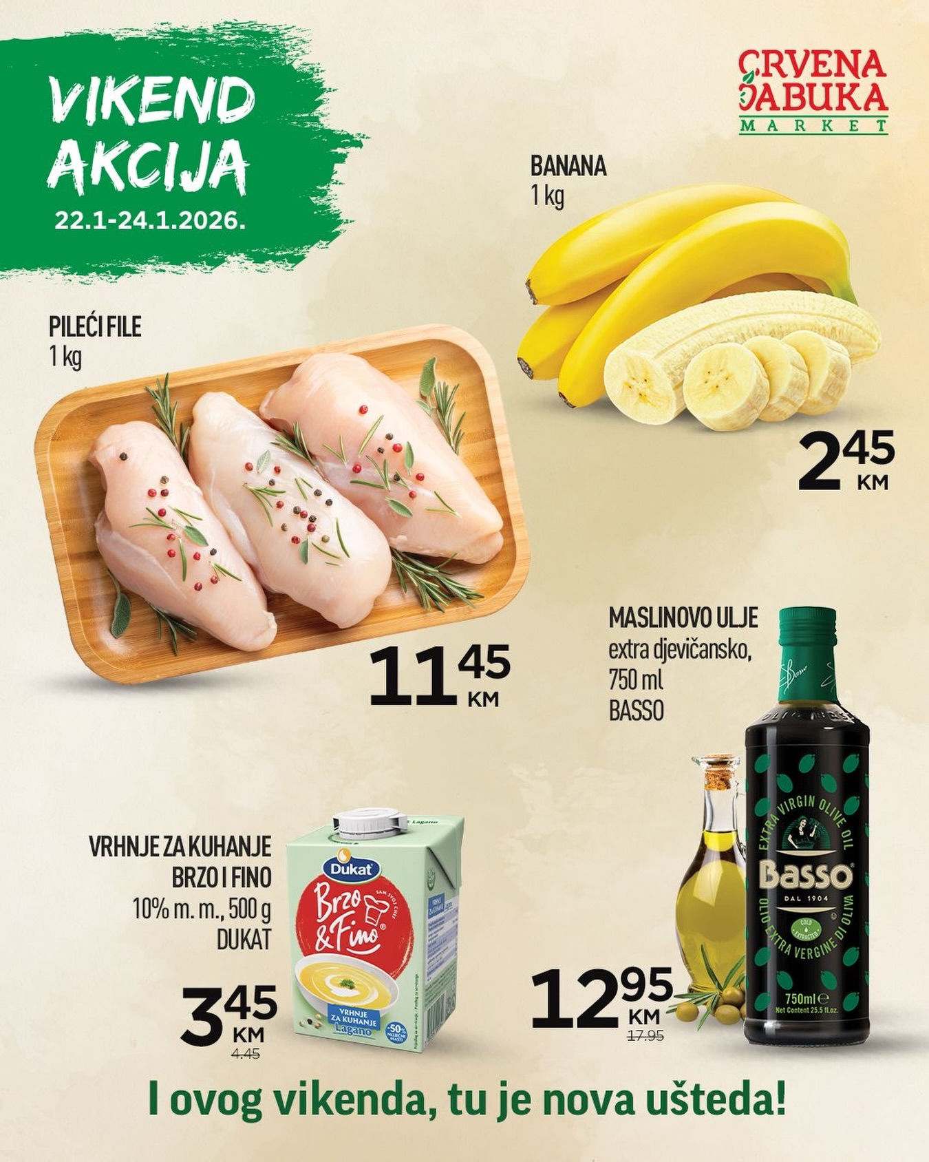 Vikend akcija u ova dva marketa ove sedmice je veoma slična. U Tropic i MojMarket radnjama banane koštaju 2,39 KM/kg, pileći file 11,49 KM/kg, jogurt Balans+ od 1 kg 2,29 KM, te maslinovo ulje, ekstra djevičansko, 750 ml, po cijeni od 12,99 KM. U Crvenoj jabuci banane koštaju 2,45 KM/kg, pileći file 11,45 KM/kg, maslinovo ulje 12,95 KM, te vrhnje za kuhanje od 500 g po cijeni od 3,45 KM.