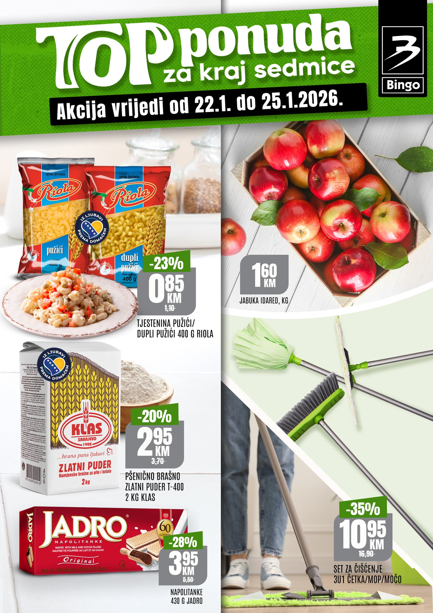 Bingo ima raznovrsnu vikend ponudu. Izdvajamo tjesteninu od 400 g po cijeni od 0,85 KM, brašno Zlatni puder T-400 od 2 kg za 2,95 KM, jabuke po 1,60 KM/kg, Bingo mlijeko od 1 l za 1,65 KM, Bingo kečap od 280 g za 1,00 KM, kao i Bingo ajvar, blagi ili ljuti, po cijeni od 2,95 KM za 350 g. Sa odjela hemije izdvajamo toaletni papir Softly (8 komada) za 3,45 KM, Teta Violeta sredstva za čišćenje od 1 l po cijeni od 2,75 KM, kao i papirne ubruse za 1,50 KM (2 komada).
