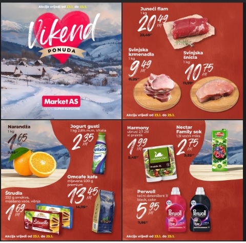 Marketi AS ovog vikenda donose povoljnije cijene za brojne proizvode. Narandže možete kupiti po 1,65 KM/kg, OM kafu od 500 g za 13,45 KM, svinjsku krmenadlu po cijeni od 9,49 KM/kg, te Perwoll tečni deterdžent po cijeni od 5,95 KM za litru.