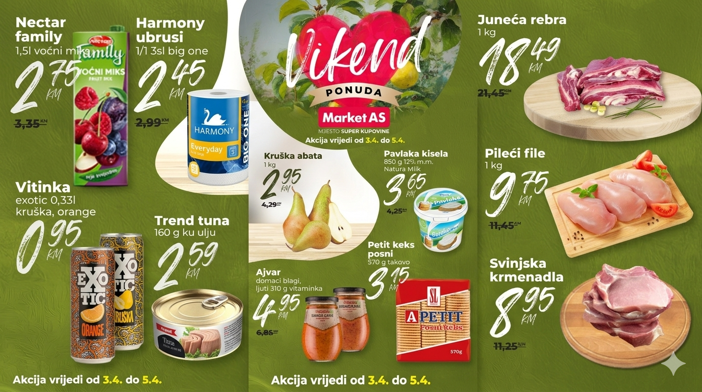 U Market AS marketima, od 3. 4. do 5. 4., očekuju vas odlične cijene za vikend kupovinu. Juneća rebra po cijeni od 18,49 KM i pileći file po 9,75 KM savršeni su za nedjeljni ručak. Uz to, možete se osvježiti Nectar Family sokom (1,5 l) za 2,75 KM ili Vitinka Exotic vodom za 0,95 KM. Ne propustite i ponudu Harmony ubrusa po 2,45 KM, kao i kiselu pavlaku Natura Milk (850 g) po sniženoj cijeni od 3,65 KM. Za ljubitelje slatkog, tu je posni Petit keks po cijeni od 3,15 KM.