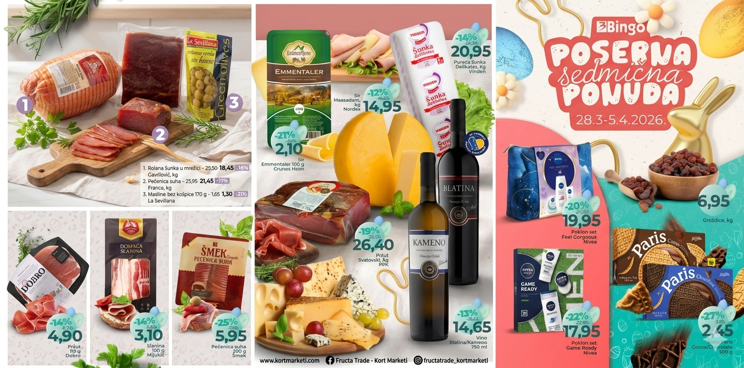 U Bingo marketima, od 28. marta do 5. aprila 2026. godine, očekuju vas sjajni popusti povodom predstojećih praznika. Za ljubitelje suhomesnatih delicija, Gavrilović rolana šunka košta 18,45 KM, dok je Franca pečenica snižena na 21,45 KM po kilogramu. U ponudi su i vrhunski sirevi, poput Nordex Maasadama za 14,95 KM. Tu su i domaća vina Blatina i Kameno po cijeni od 14,65 KM. Ukoliko tražite poklon za najmilije, Nivea setovi su sniženi na 19,95 KM, a za prazničnu trpezu tu su i grožđice po cijeni od 6,95 KM za kilogram.