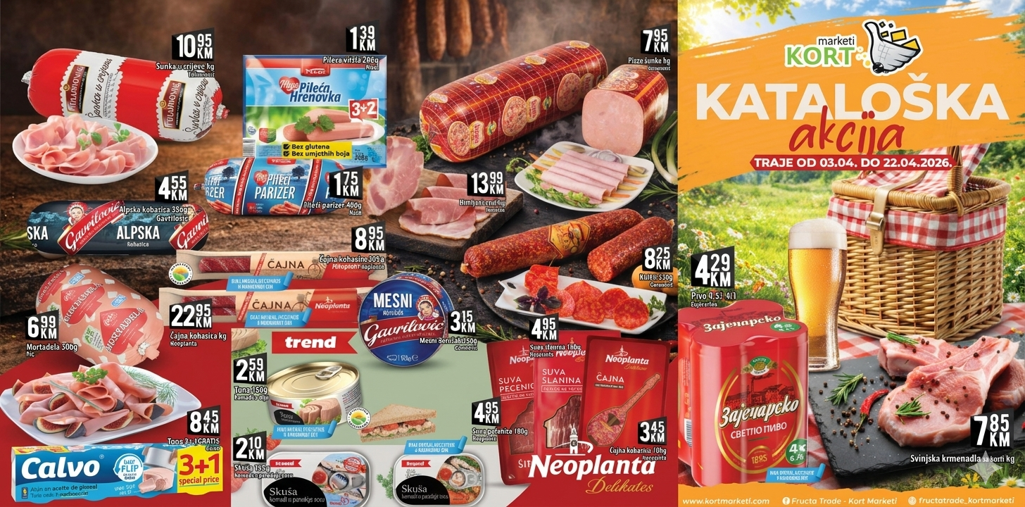 Aktuelna kataloška akcija u Kort marketima nudi odlične prilike za uštedu pri svakodnevnoj kupovini, pa tako kilogram svinjske krmenadle sa kosti košta samo 7,85 KM. Na bogatom odjelu delikatesa izdvajaju se dimljeni vrat po cijeni od 13,99 KM za kilogram, te Pikova mortadela od 500 grama za 6,99 KM. Za brz i povoljan obrok, tu je Madi pileća hrenovka u pakovanju 3+2 za svega 1,39 KM, kao i Calvo tuna 3+1 gratis po cijeni od 8,45 KM. Uz ukusan ručak, kupci se mogu osvježiti i Zaječarskim pivom čije pakovanje od četiri limenke iznosi 4,29 KM.