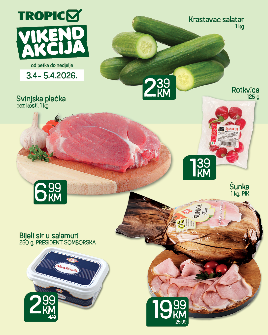 Vikend akcija u Tropic marketima, koja traje od 3. do 5. aprila, nudi odlične prilike za kupovinu svježeg mesa i povrća. Kilogram svinjske plećke bez kosti iznosi samo 6,99 KM. Kvalitetna PIK šunka snižena je na 19,99 KM. Za laganu salatu uz ručak, potražite krastavac salatar po cijeni od 2,39 KM i rotkvice za 1,39 KM. Posebno izdvajamo i mliječni program, gdje se bijeli sir u salamuri President Somborska (250 g) može kupiti po sniženoj cijeni od 2,99 KM.