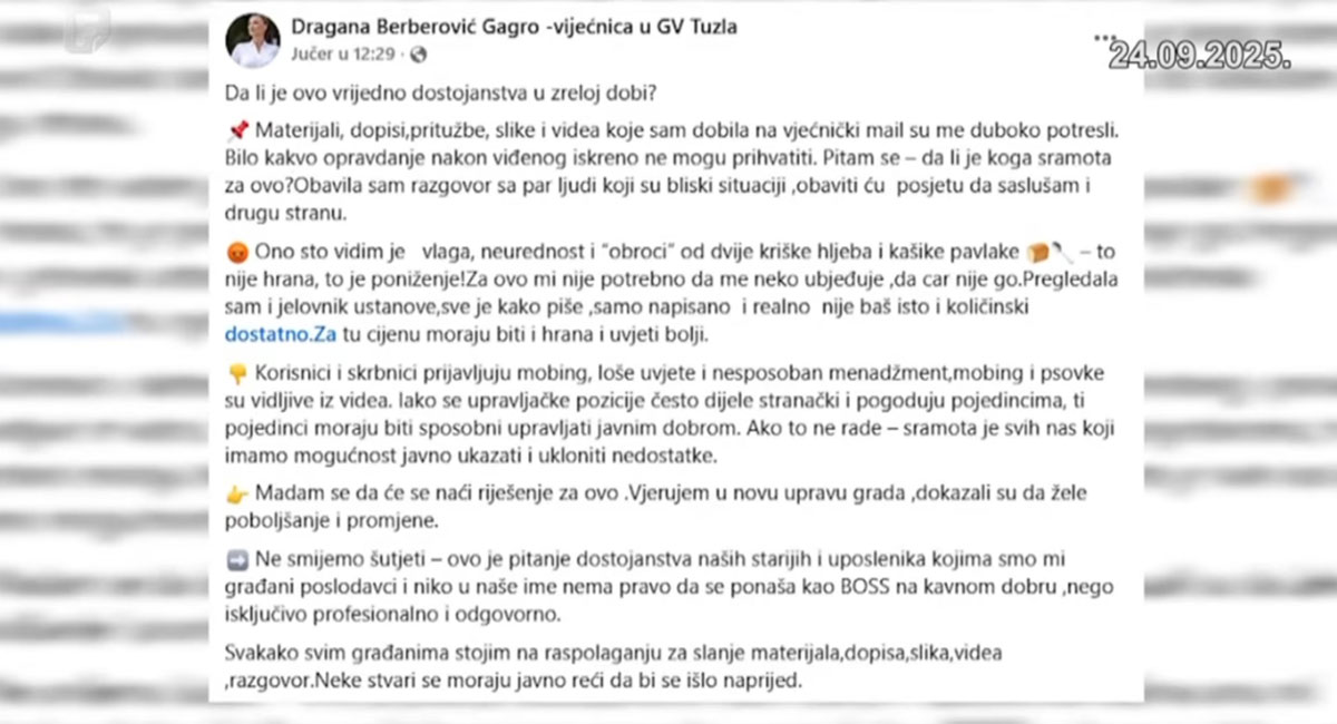 “Obavila sam razgovor s par ljudi koji su bliski situaciji, obaviti ću posjetu da saslušam i drugu stranu. Ono sto vidim je vlaga, neurednost i ‘obroci’ od dvije kriške hljeba i kašike pavlake – to nije hrana, to je poniženje! Korisnici i negovatelji prijavljuju mobing, loše uslove i nesposoban menadžment, mobing i psovke su vidljive iz videa”, objavila je na svom Facebook profilu Gagro-Berberović.