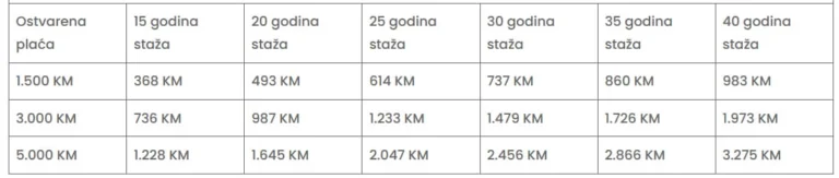 Ako je osiguranik tokom 15 godina rada imao prosječnu platu od 1.500 KM, očekivana penzija iznosila bi 368 KM. Za 20 godina rada oko 493 KM, za 25 godina 614 KM, za 30 godina 737 KM, za 35 godina 860 KM, a za 40 godina staža oko 983 KM.