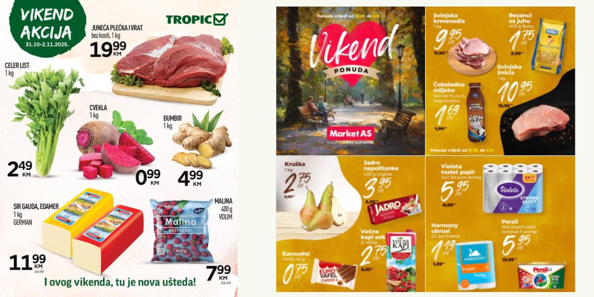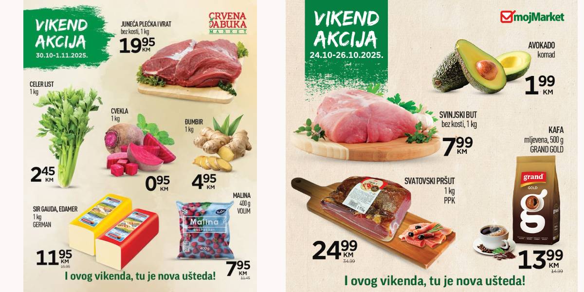 Vikend akcija u Tropic marketima, Crvenoj jabuci i i MojMarket prodavnicama nudi kilogram celerovog lista za 2,49 KM, dok je juneća plećka bez kosti 19,99 KM. Dalje, na akciji je i cvekla koja za kilogram košta 0,99 KM, a đumbir takođe po kilogramu košta 4,99 KM. Sir Gauda i Edamer može se naći po cijeni od 11,99 KM po kilogramu dok je zamrznuta malina od 400 grama košta 7,99 KM.