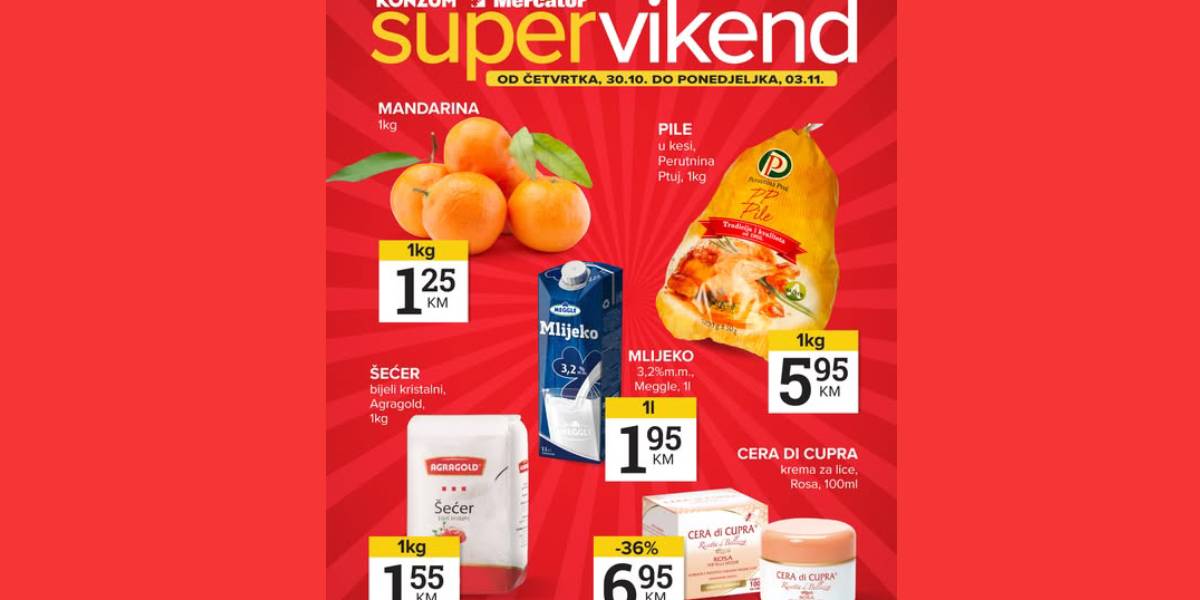 U Mercator i Konzum trgovinama pile po kilogramu košta 5,95 KM, a mandarine po kilogramu 1,25 KM. Mlijeko sa 3,2 posto mliječne masti košta 1,95 KM, dok Poli parizer košta 3,95 KM umjesto 4,95 KM koliko mu je redovna cijena. Na akciji je i šećer koji košta 1,55 KM za kilogram dok su tablete za pranje veša 6,95 KM za deset pranja.