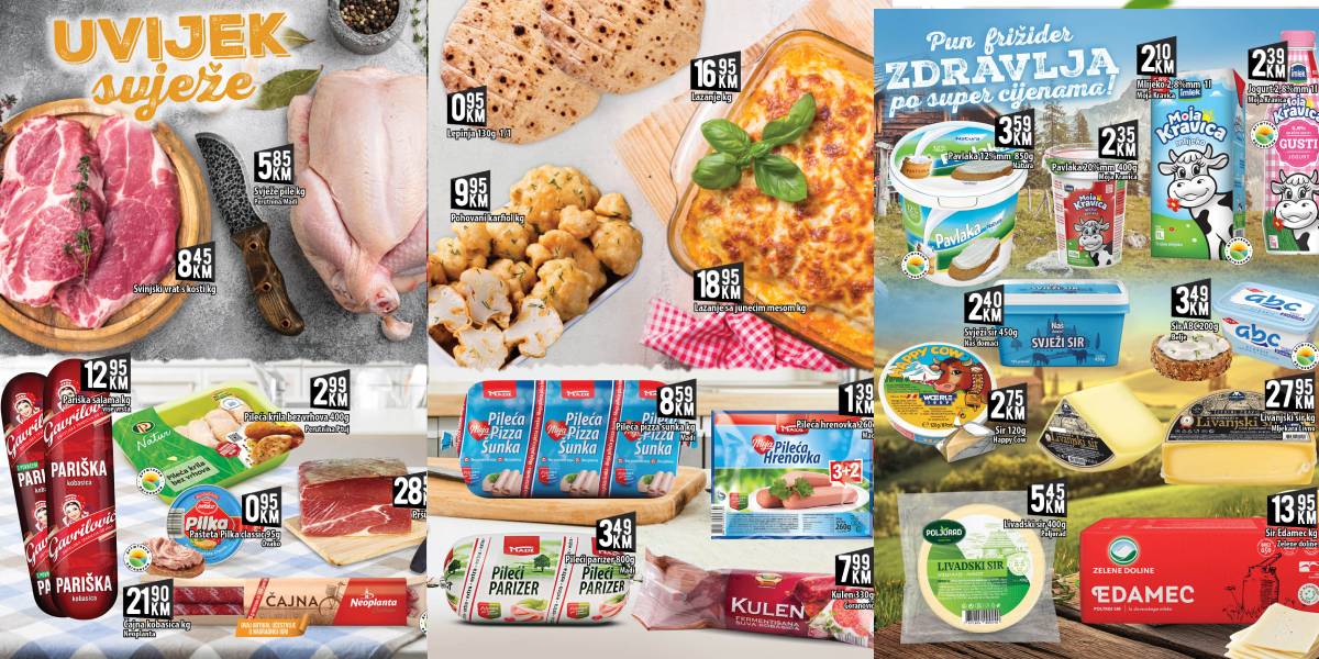Svinjski but na akciji košta 8,45 KM po kilogramu dok je Srpska kobasica 3,35 KM za 300 grama. Vitalia povlaka sa 20 posto mliječne masti košta 4,59 KM za 800 grama dok je zamrznuti špinat 2,35 KM za 400 grama.