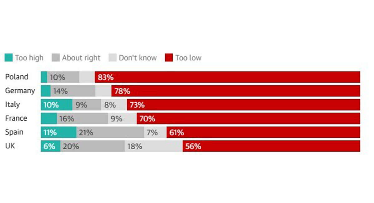 Istraživanje YouGova provedeno u šest zemalja pokazuje razmjere problema s javnim mnijenjem s kojim se vlade suočavaju. Istraživanje je provedeno u Italiji, Francuskoj, Njemačkoj, Španiji, Poljskoj i Velikoj Britaniji.