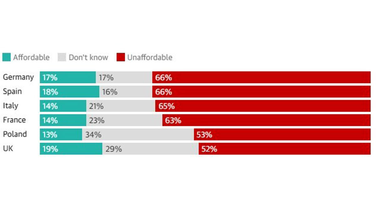 Mnogi građani priznaju da su sistemi državnih penzija u ozbiljnim problemima. Većine između 61% i 52% ispitanika u Italiji, Francuskoj, Njemačkoj i Španiji izjavile su da je njihov sistem već sada neodrživ. To misli i 45% ispitanih u Poljskoj. U Ujedinjenom Kraljevstvu (UK) taj udio iznosi 32%.