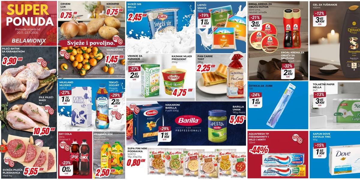 Na policama Belamionix marketa ovog vikenda dostupan je pileći batak sa krabatakom po cijeni od 3,90 KM. Tsu su I crveni luk I krompir po cijeni 0,75 KM, dok su mandarine 1,45 KM. Mlijeko Milkland je 1,75 KM za litru I sniženo je 27%. Svježi sir Bella od 400 g možete kupiti za 2,45 KM, dok je President kajmak od 250 g 4,75 KM.