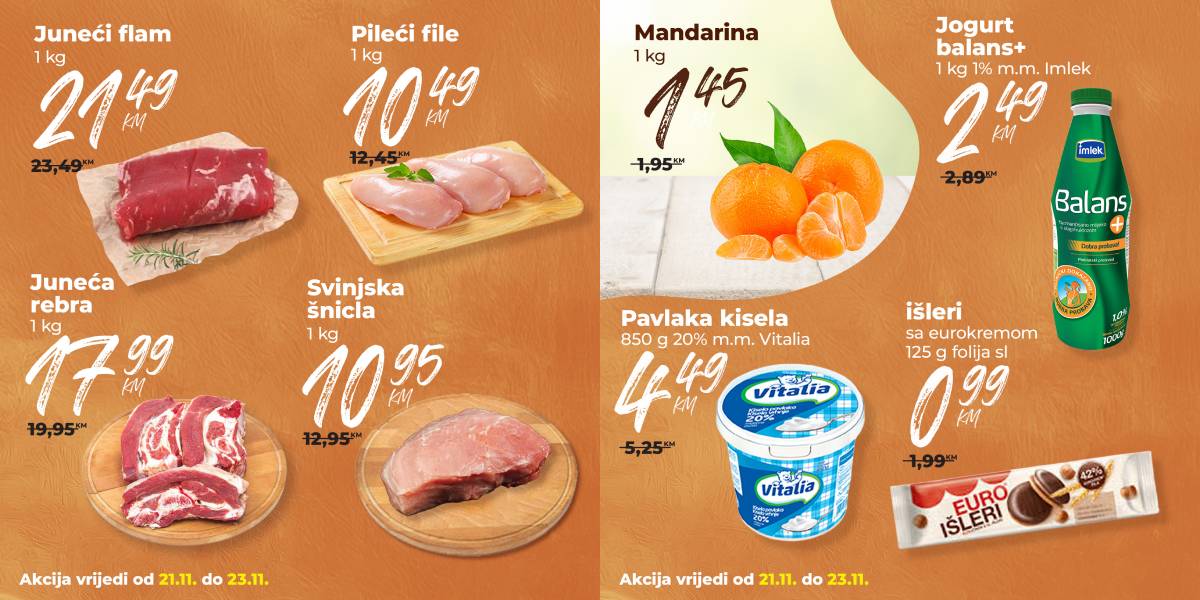 U AS marketima na akciji je pileći file po cijeni od 10,49 KM/kg, dok se svinjska šnicla može kupiti za 10,95 KM/kg. Tu je i juneći flam po cijeni od 21,49 KM po kilogramu. Za Balans jogurt od jedne litre potrebno je izdvojiti 2,49 KM, dok su mandarine ovaj vikend na akciji i koštaju 1,45 KM.