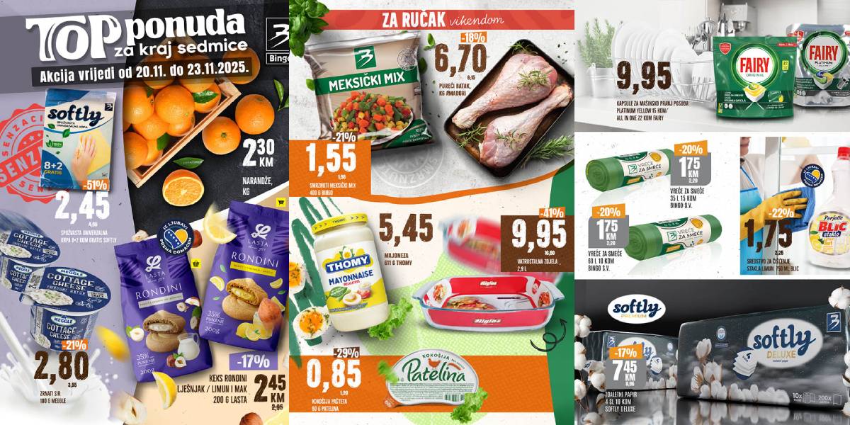 Bingo donosi Top ponudu za kraj sedmice, a mi izdvajamo narandže po cijeni od 2,30 KM za kilogram. Zaleđeni meksički miks snižen je 21% i cijena za 400 g iznosi 1,55 KM. Na akciji je I Patelina kokošija pašteta koja košta 0,85 KM. Sa odjela hemije izdvajamo detrdžent za suđe Blic po cijeni od 1,75 KM za 750 ml.