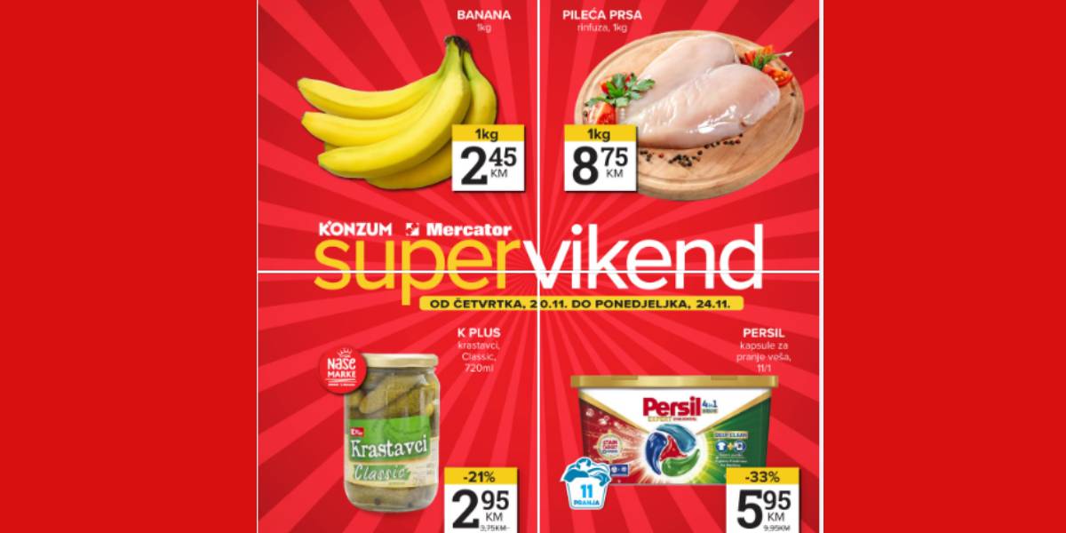 Konzum/Mercator je pripremio akciju u kojoj banana možete kupiti za 2,45 KM, a pileća prsa po cijeni od 8,75 za kilogram. Kiseli krastavac K plus ovaj vikend je snižen 21% I košta 2,95 KM za teglu od 720ml.