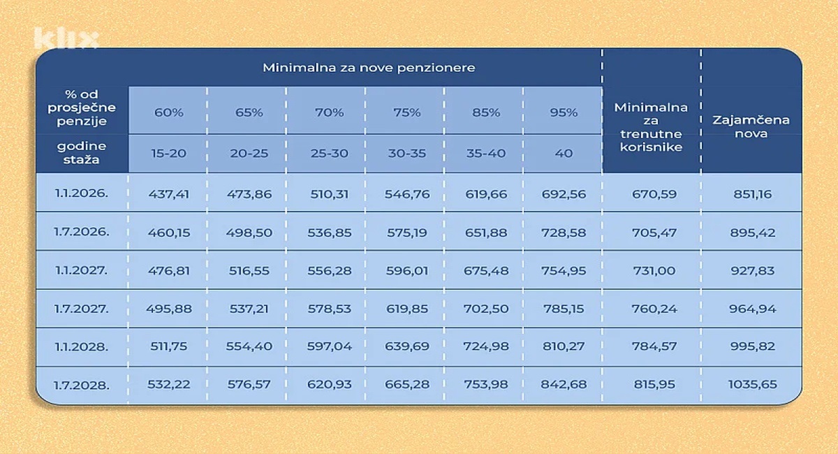 Npr: Ukoliko ste ostvarili pravo na minimalnu penziju, a imate između 15 i 20 godina radnog staža, dobijat ćete 60 posto od prosječne penzije u tom trenutku, a ako imate iznad 40 godina radnog staža, dobijat ćete 95 posto od prosječne penzije. U tabeli je detaljno prikazan obračun postotaka, prenosi Klix.