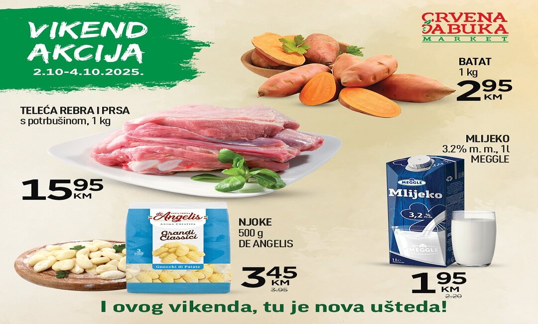 Nova vikend akcija biće i u marketima Crvena jabuka gdje će mlijeko sa 3,2 posto mliječne masti koštati 1,95 KM, a teleća rebra i prsa 15,95 KM, a njoke od 500 grama koštaće 3,45 KM.