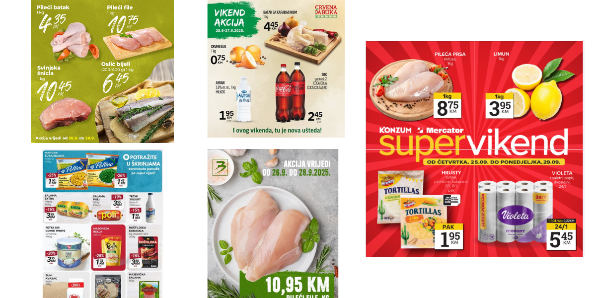 Konzum/Mercator je pripremio akciju na pileća prsa koja koštaju 8,75 KM/kg, limun po cijeni od 3,95 KM/kg, Hrusty tortilje za 1,95 KM po pakovanju, te Violeta toaletni papir (24 rolne) po cijeni od 5,45 KM.