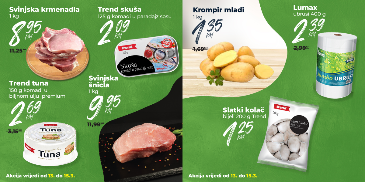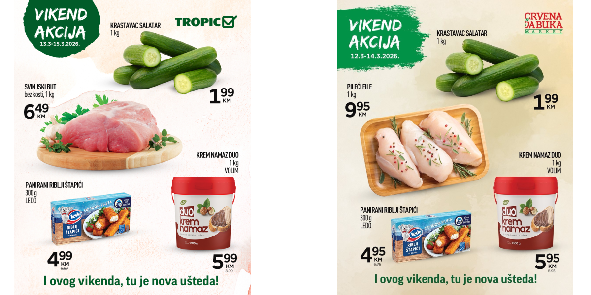 U ovim marketima fokus je na krastavcu salataru koji košta 1,99 KM. Dok Tropic nudi svinjski but bez kosti za 6,49 KM, Crvena jabuka nudi pileći file za 9,95 KM. Ovdje možete pronaći i Duo krem namaz u velikom pakovanju od 1 kg za manje od 6,00 KM, što je odlična dopuna kućnoj ostavi.