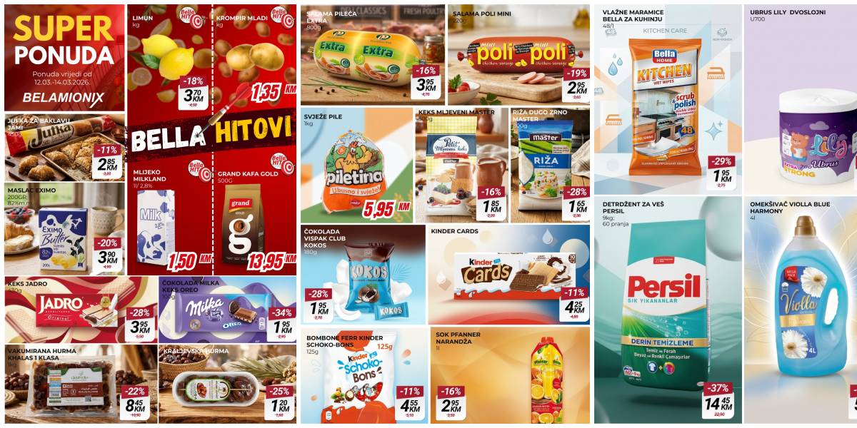 Belamionix se ovog vikenda ističe ponudom higijenskih potrepština. Persil deterdžent od 9 kg (60 pranja) za 14,45 KM je prilika koja se ne propušta, jer ovakva zaliha može trajati mjesecima. Također, za penzionere koji vole ugostiti unuke, Grand kafa od 500 g košta 13,95 KM, a Milka čokolade su snižene na 1,95 KM.