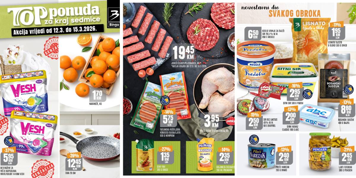 Najveći domaći lanac u svojoj „TOP ponudi“ fokus stavlja na svježe narandže (1,70 KM) i pileće batake (3,95 KM), što je izvrsna opcija za laganiji obrok. Pored hrane, Bingo nudi i tavu od 28 cm za 12,45 KM, pa ako je staroj vrijeme za zamjenu, sada je trenutak. Za brzi doručak, tu su sirni namazi i mliječni dodaci po cijenama već od 2,00 KM.