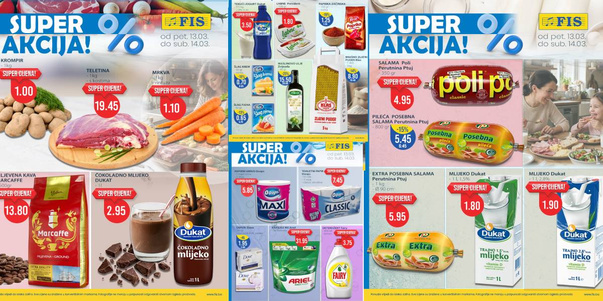 Prodajni centri FIS širom Bosne i Hercegovine od 13. do 14. marta postaju prava destinacija za ljubitelje domaćih jela. Posebno se izdvaja cijena krompira od samo 1,00 KM po kilogramu, što je trenutno među najnižim cijenama na tržištu. Uz teletinu s kostima po cijeni od 19,45 KM, penzioneri mogu pripremiti tradicionalni ručak uz znatnu uštedu. Ne treba zanemariti ni povoljno pakovanje brašna od 5 kg za 8,90 KM, kao ni mliječne proizvode Dukat koji su na značajnom sniženju.
